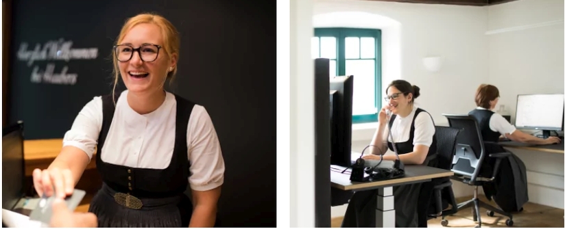 Not a trace of stress. On the contrary. When Kathrin Huber answers the phone at Haubers, it sounds like a vacation – completely relaxed. “Sometimes I’m surprised myself at how grateful guests are that we take the time to ask exactly what they need,” says the 29-year-old reception and reservations manager with a remarkably warm smile. All the threads come together in her hands: She makes the plans for ten reception staff, evaluates figures for marketing and invites people to team meetings. At the front office, she checks guests in and out or looks for suitable hiking routes. In the office, Kathrin’s focus is on the room occupancy plan. And on the guests, of course. As soon as the phone rings, the Allgäu native searches for the right room at lightning speed. For over ten years (with interruptions for stays abroad), she has been inspiring people to stay at the nature resort. “Location, staff, rooms, pool… it’s simply fantastic here. I can recommend it with a clear conscience.”